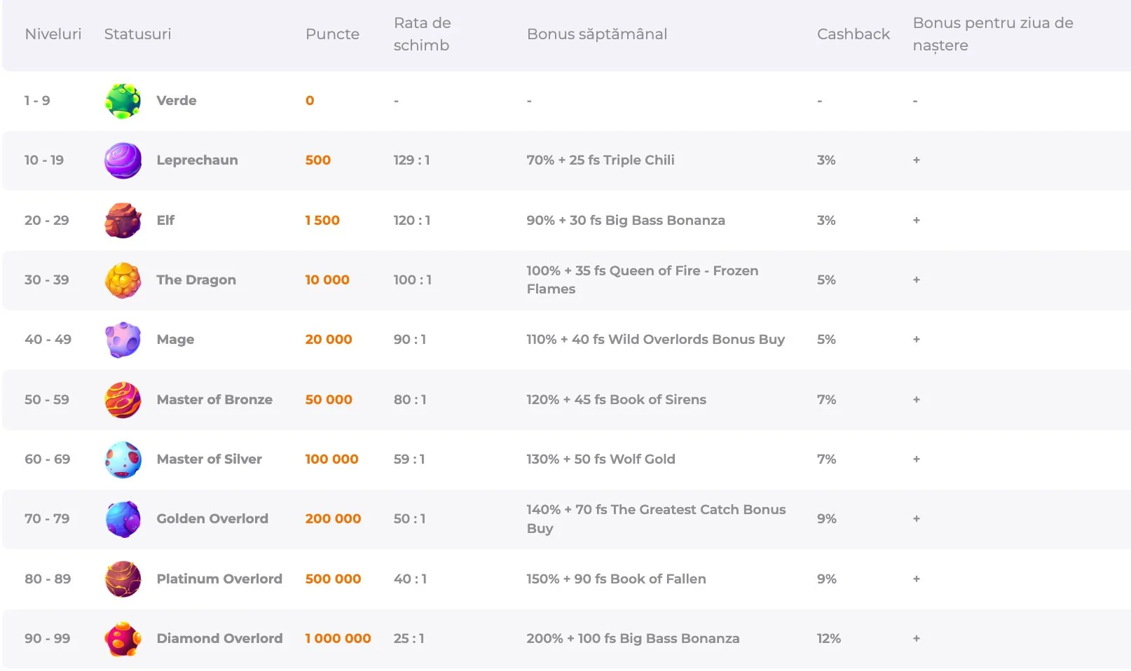 Pentru a acumula bani reali, trebuie doar să aduni puncte, care sunt acordate în funcție de suma cheltuită în jocuri. Fiecare 40 RON cheltuiți îți aduc 1 punct. Punctele acumulate contribuie la statutul tău în programul de fidelitate și sunt colectate în contul tău.